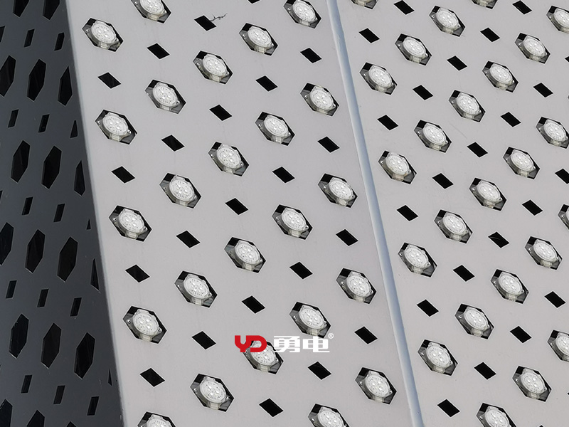 該項目夜景視野開闊,對亮燈效果要求高,為保證建筑外觀的美觀性,燈具采用沖孔鋁板安裝的方式,將點光源安裝在沖孔鋁板的孔位內(nèi),鋁板噴涂建筑表面漆色,使用黑色線路板的點光源完美與建筑物外墻融為一體。